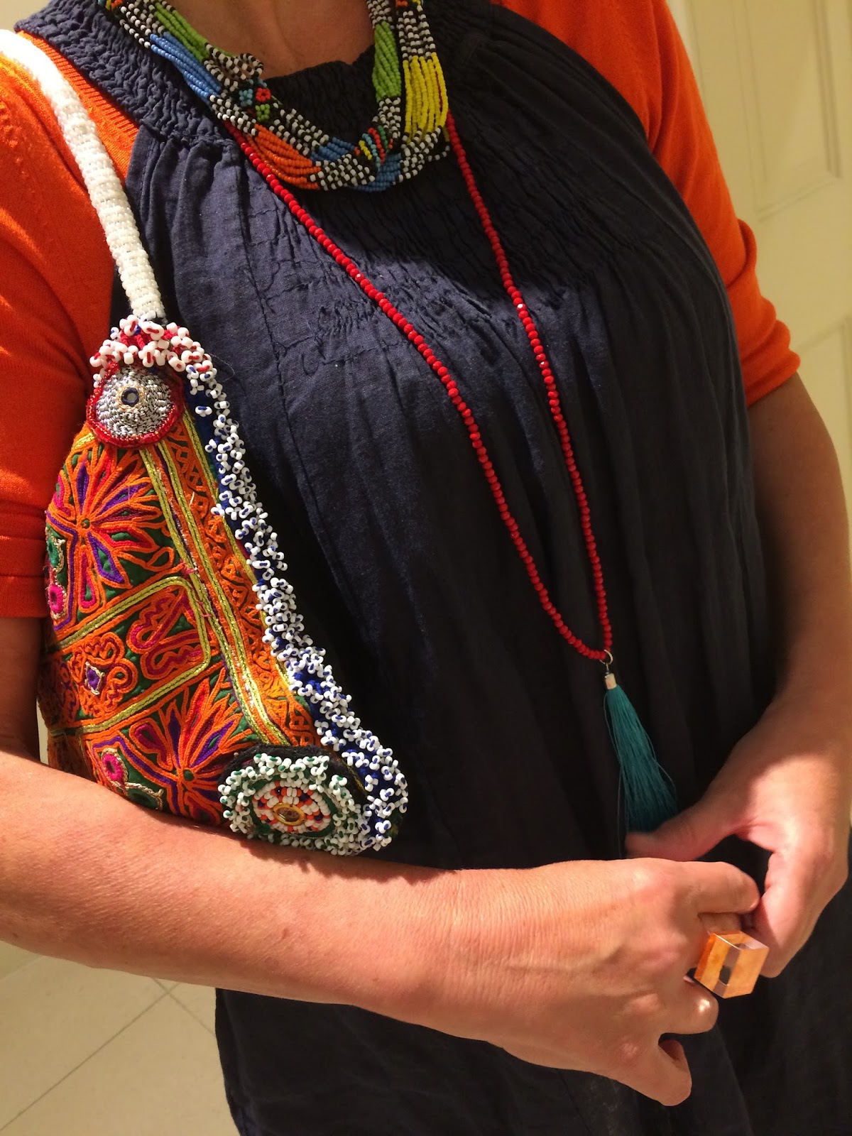 For ease, I'm wearing a simple linen shift (made in Italy, purchased in Crystal Palace) and my comfortable Supergas, excellent for walk-abouts and those cobbles in the Somerset House courtyard. For essential colour, under changeable September skies, I added a dash of orange with my Parosh top, and lots of ethnic beads and bag. The sunnies are by Moschino. The location are the environs of Somerset House, now a mecca for the creative arts, and with its own fine spirit of place.