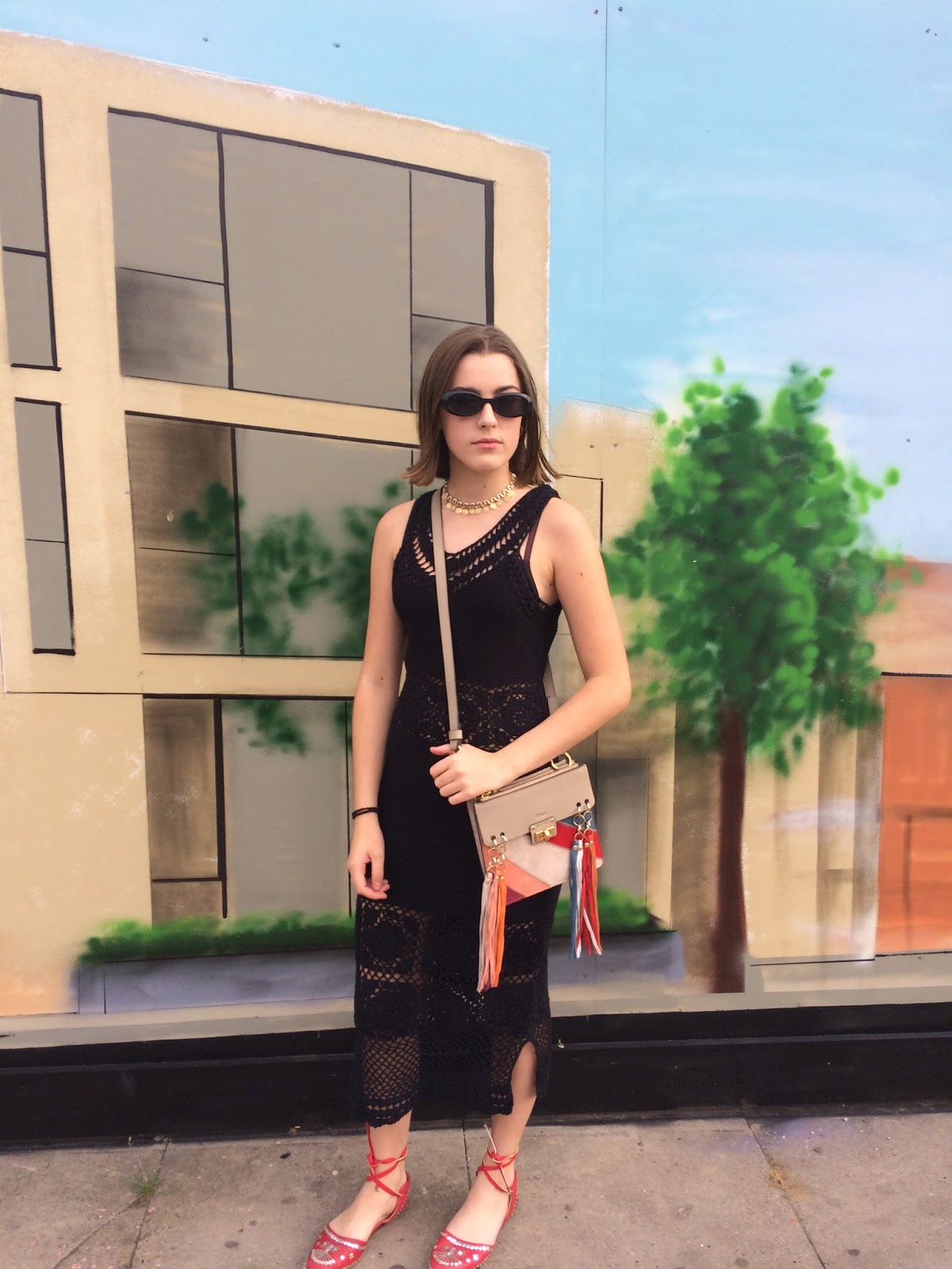 La Teen wore a contrasting number of great little dresses from an Asos black crochet dress to a mixed fabric tweed/ sheer piece from Three Floor, all of which looked striking against Crofton Park's eye-catching street art.
